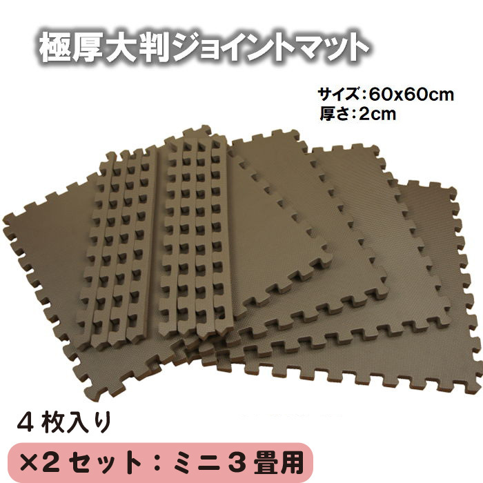 極厚大判ジョイントマット ブラウン色 4枚(約60x60x2cm/枚)x2セット 3畳用(8枚) 洗えるパズルマット 衝撃吸収 サイドパーツ付