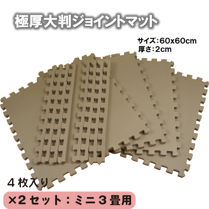 極厚大判ジョイントマット モカ色 4枚(約60x60x2cm/枚)x2セット 3畳用(8枚) 洗えるパズルマット 衝撃吸収 サイドパーツ付