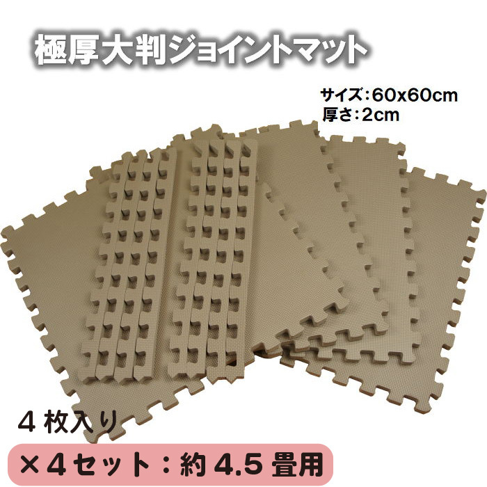 極厚大判ジョイントマット モカ色 4枚(約60x60x2cm/枚)x4セット 4.5畳用(16枚) 洗えるパズルマット 衝撃吸収 サイドパーツ付