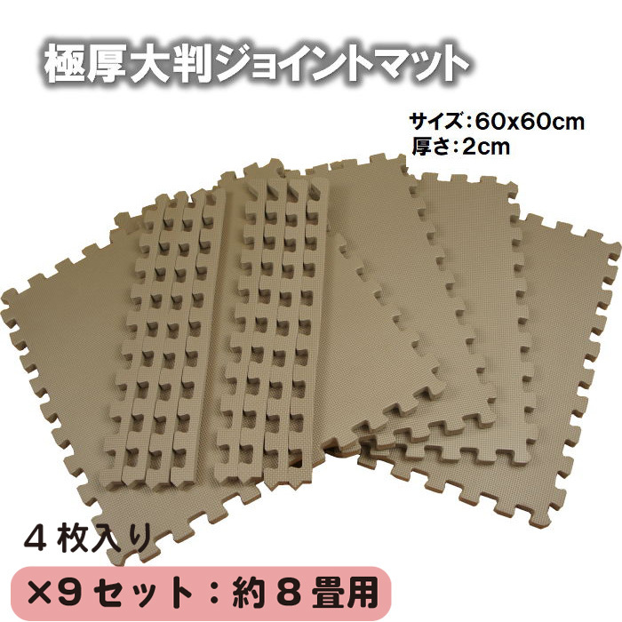 極厚大判ジョイントマット モカ色 4枚(約60x60x2cm/枚)x9セット 8畳用(36枚) 洗えるパズルマット 衝撃吸収 サイドパーツ付