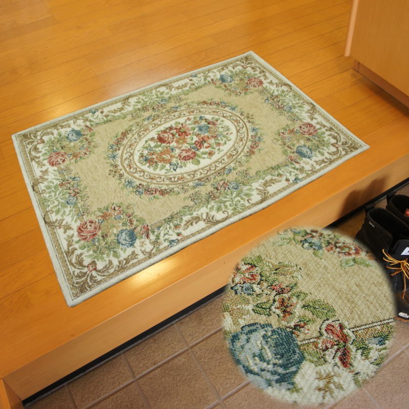 50x80cm 北欧王朝柄「パレス」ベージュ色 ゴブランシェニール織 玄関マット インテリアマット 室内用マット