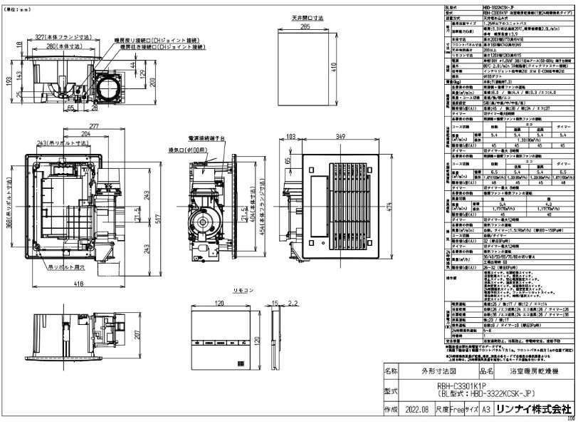 | 商品名 | リンナイ(Rinnai) プロパンガス LP 1室換気対応 RBH-C3301K1P 浴室暖房乾燥機 天井埋込型 コンパクトタイプ 26-5955 在庫処分 |