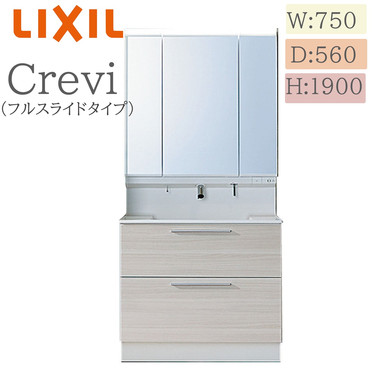 基本寸法:間口750× 奥行560×高さ1900 クレヴィ 洗面化粧台 交換 取り替え キャビネット おしゃれ