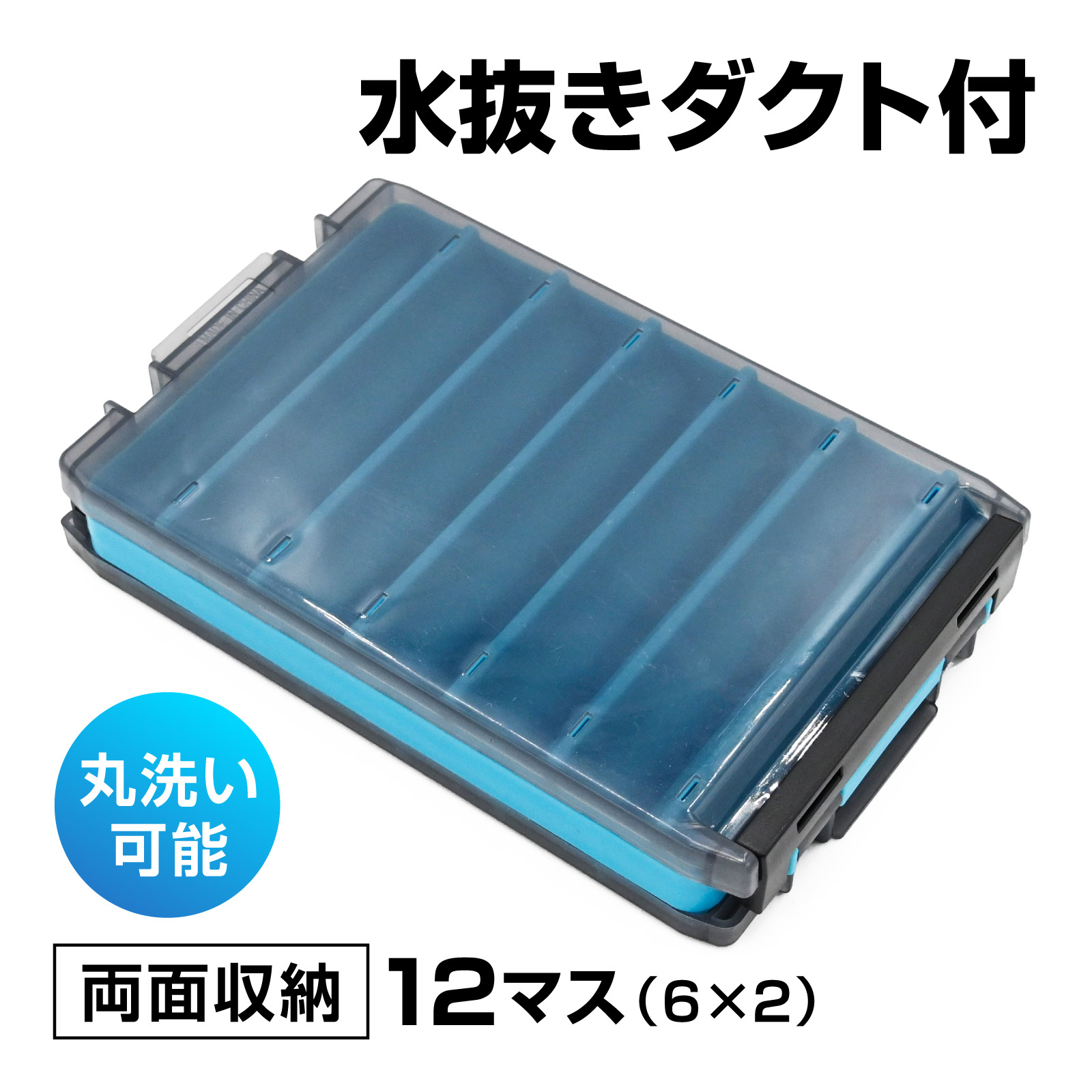 12個のルアーを個別に収納でき、フック同士が絡まずスムーズに取り出せます。水抜きダクト付きで丸洗い可能、使用後のお手入れも簡単です。