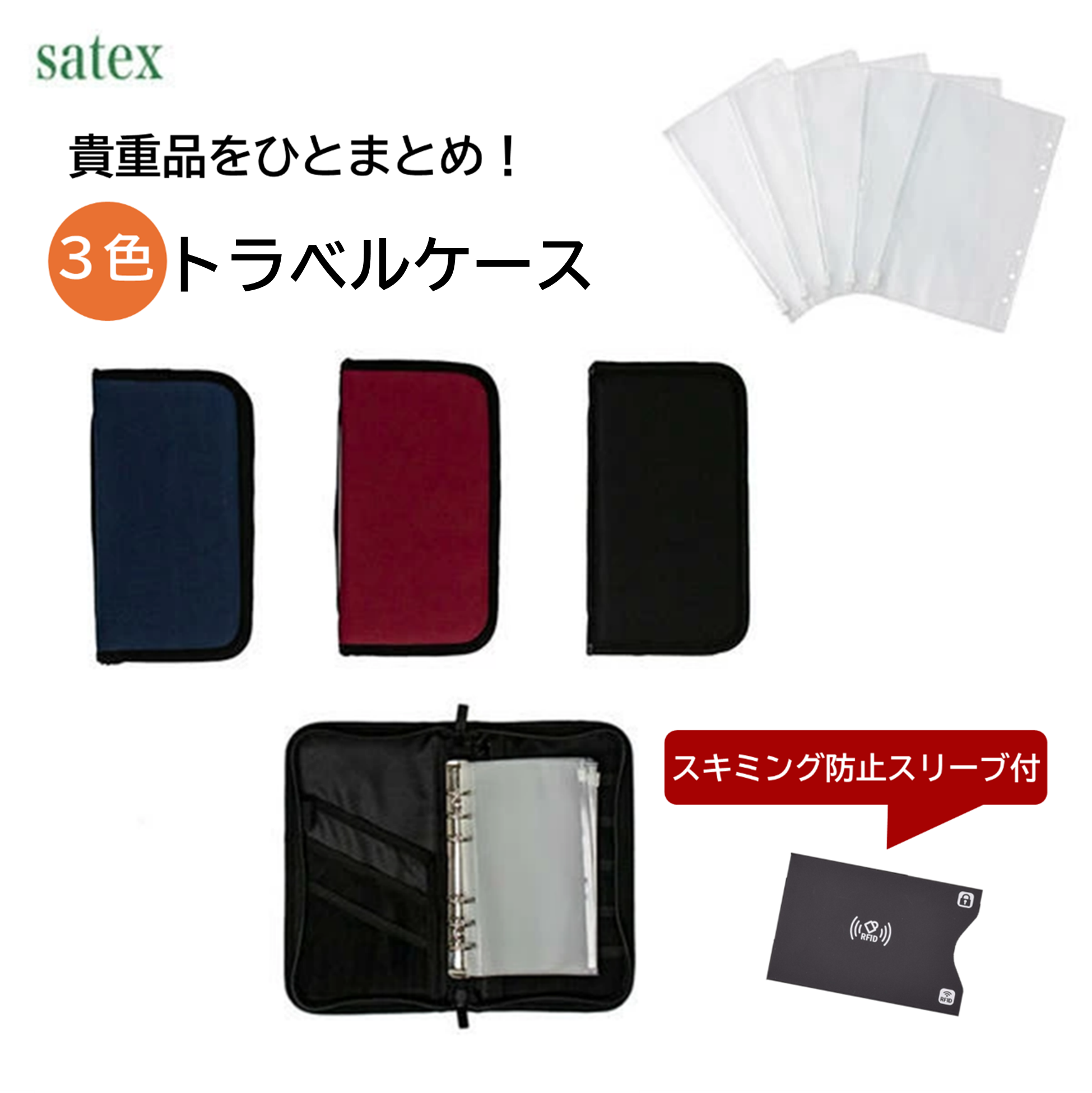 【スキミング防止スリーブ付】トラベルケース パスポートケース 6枚クリアポケット付【3カラー】 仕分けができる パスポートホルダー 収納ケース 貴重品ケース