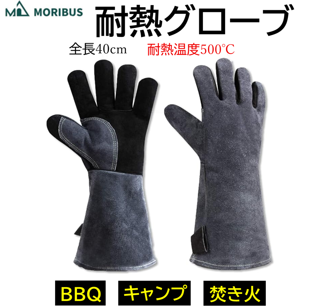 【MORIBUS】全長40cm 手首まで保護 厚さ1.2mm(左右セット)牛革 BBQ手袋 耐熱グローブ 革手袋 作業用 耐熱 手袋 キャンプグローブ バーベキュー 耐摩耗性