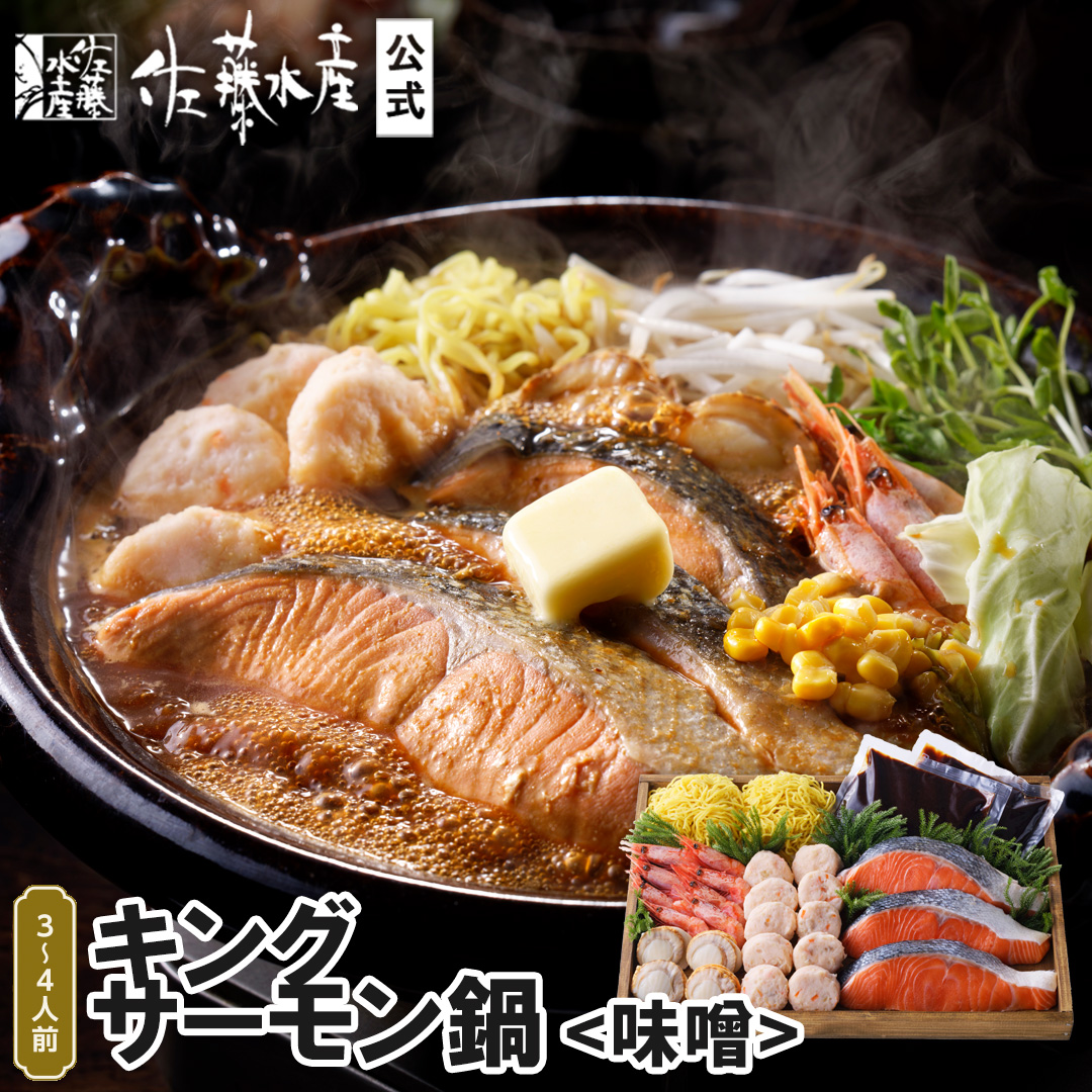 ■セット内容:キングサーモン切身(390g)、鮭つみれ(250g)、ボイル帆立(4個)、甘えび(100g)、鍋用ラーメン(80g×2)、味噌だれ(2袋)