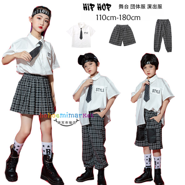 キッズダンス衣装制服半袖シャツhiphopkpop舞台団体服演出服女の子男の子スクールユニフォームシャツチェック柄スカートショーツ長ズボンヒッ
