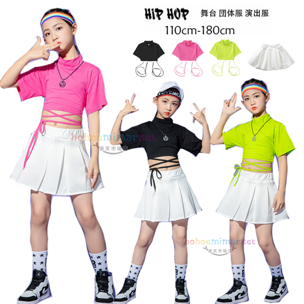 キッズダンス女の子へそ出しTシャツ無地半袖Tシャツチアリーディングキッズダンススカートhiphopkpop韓国舞台団体服演出服ガールズTシャツス