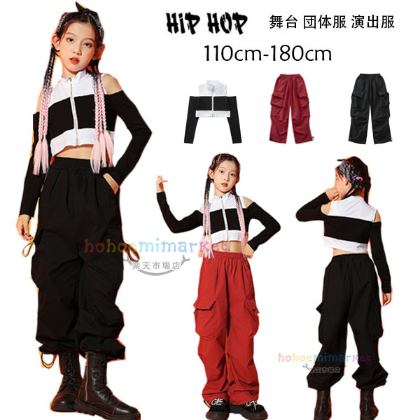 ダンス衣装女の子ブラックパンツレッドパンツ舞台団体服演出服キッズhiphopK-pop長袖Tシャツへそ出しトップス肩出しおしゃれ長ズボンダンスウ