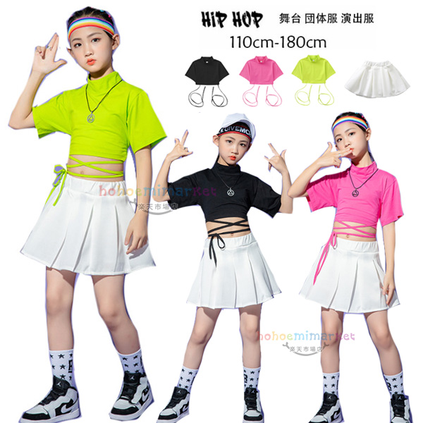 キッズダンス女の子へそ出しチアリーディングキッズダンス半袖Tシャツ無地スカートhiphopkpop韓国舞台団体服演出服ガールズTシャツスカートス