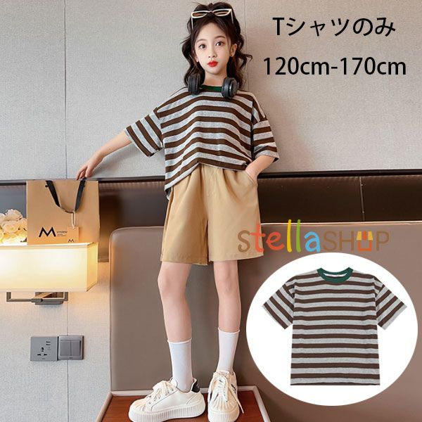 韓国子供服 女の子 半袖 Tシャツ ストライプ柄 カジュアル系 トップス 普段着 通学着 運動着 ジュニア服 丸首 tシャツ 綿 ストライプ Tシャツ 旅行 お出かけ リ