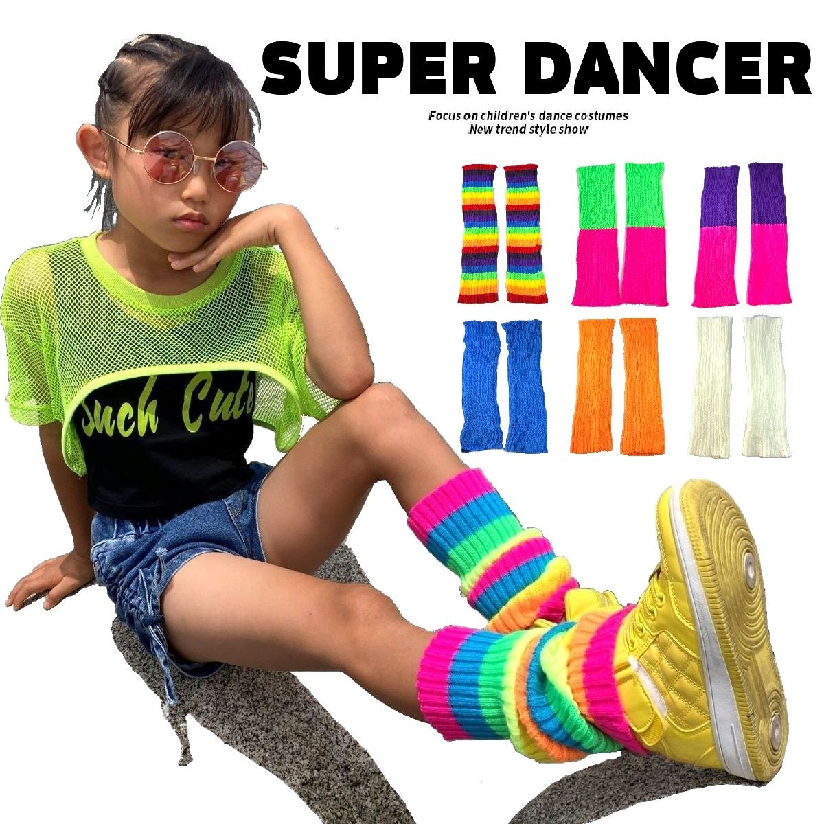 カラフルレッグウォーマー ダンス衣装 小物 キッズ ヒップホップ ファッション キッズダンス衣装 マルチボーダー ネオンカラー ピンク 紫 オレンジ 青 白 K-POP