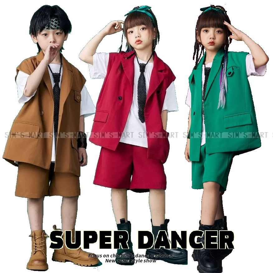 キッズダンス衣装 セットアップ ヒップホップ 衣装 ダンス衣装 キッズ 子供ダンス服 派手 男の子 ガールズ ベスト パンツ K-POP 韓国 茶色 赤 緑