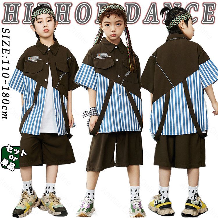 ブラウン ブルー ストライプ柄 キッズ ダンス衣装 セットアップ 女の子 男の子 おしゃれ かっこいい 半袖シャツ ゆったり カジュアルシャツ トップス 短パン ハ