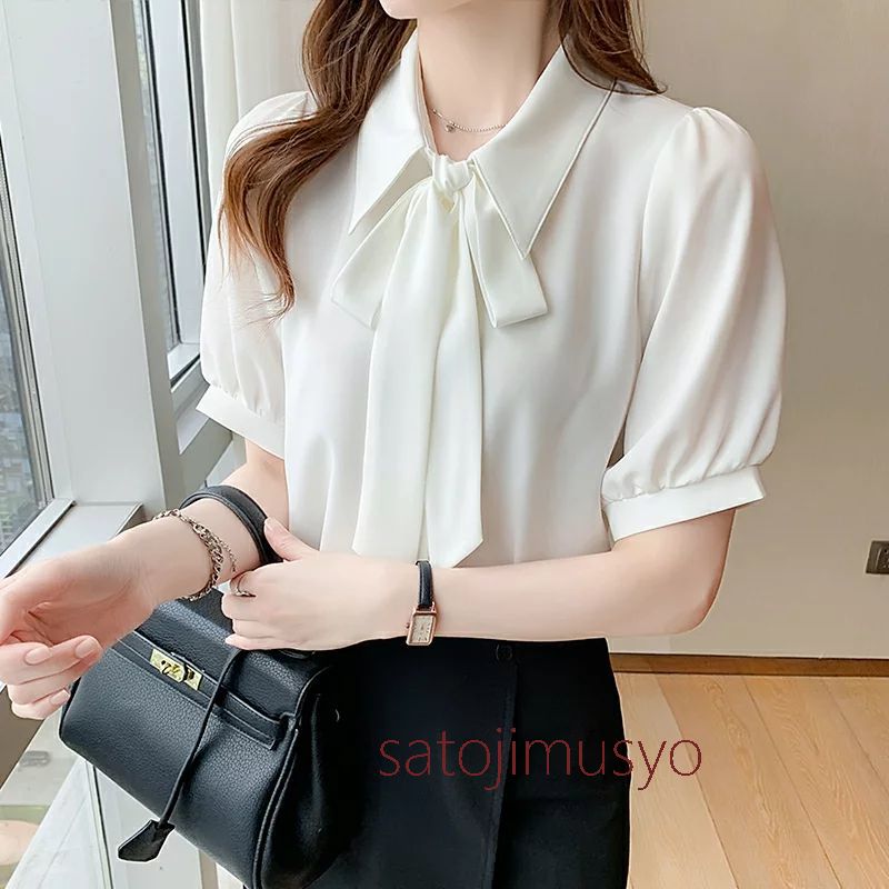 ボウタイ シャツ ブラウス シフォン 半袖 夏 レディース 事務服 レディース トップス 前開き 会社 仕事着 フォーマル クールビズ 通勤 OL オフィス ビジネス 体