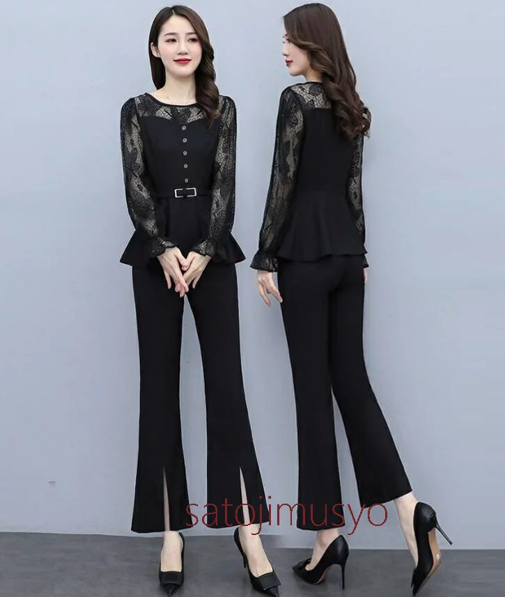 ○トップス+パンツ タキシード:セットアップ カジュアル レディーススーツ 春秋 パンツスーツ 上下セット 通勤 OL オフィス フォーマル 結婚式 二次会 30代 40代 50代 おしゃれ カジュアルスーツ 大きいサイズ S M L XL 2XL 3XL ブラック 黒 きれいめ 春夏 レース フリル トップス&パンツ 2点セット