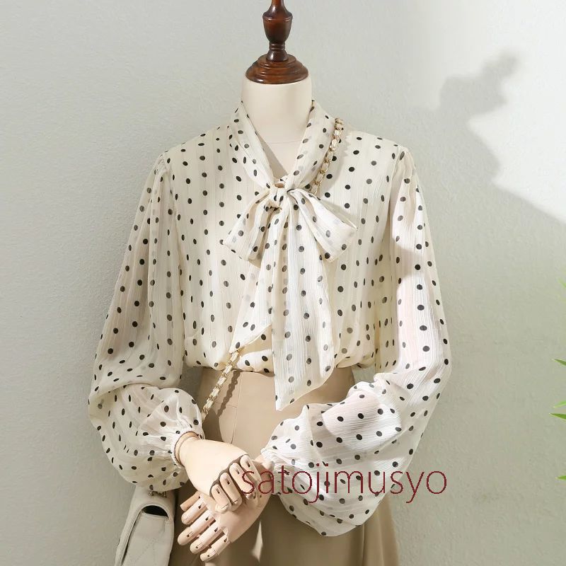ボウタイ シャツ レディース きれいめ 水玉 ドット柄 可愛い 長袖 トップス ブラウス 前開き 大人 通勤 OLオフィス 事務服 仕事 ビジネス 20代30代40代50代 マ
