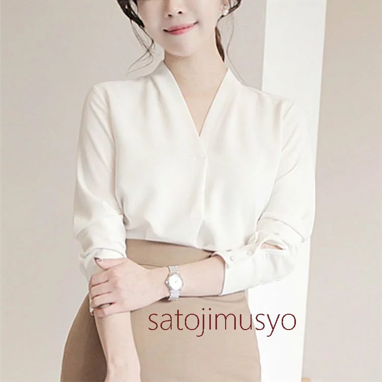 ブラウス シャツ Vネック 長袖 ビジネス OL オフィス フォーマル リクルート 就活 通勤 事務服 制服 きれいめ おしゃれ 無地 ホワイト 白 グレー 20代30代40代50