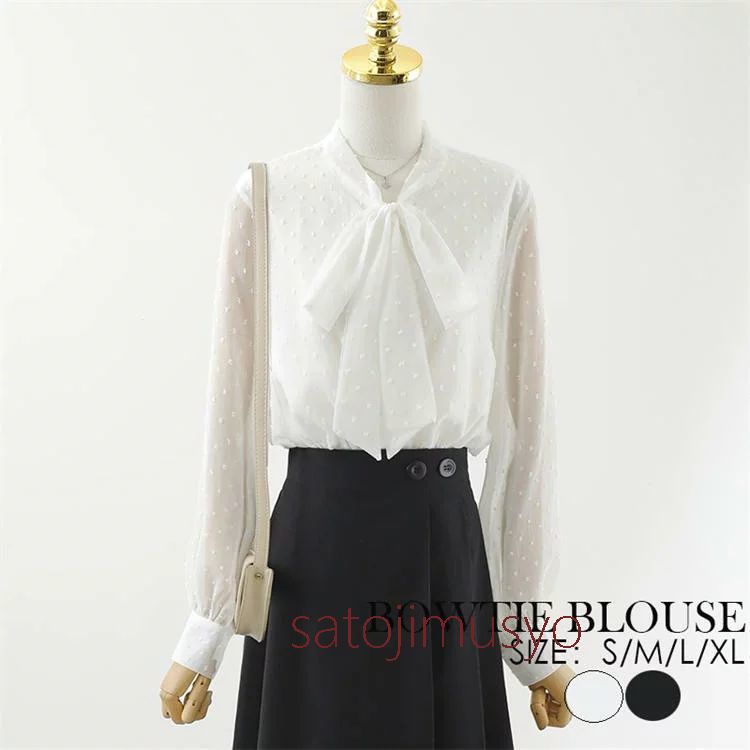 綺麗め ブラウス シャツ ボウタイ 長袖ブラウス 水玉 ドット柄 白シャツ 黒シャツ レディース 事務服 トップス 就活 通勤 OL オフィス レギュラー フォーマル 卒