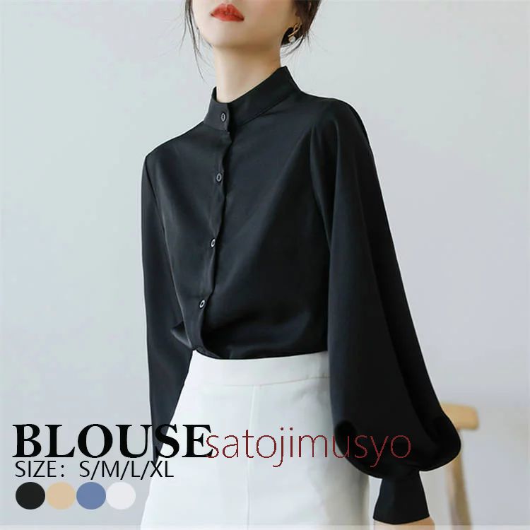 シャツ トップス シンプル ブラウス ハイネック 白シャツ 黒シャツ 長袖シャツ パフスリーブ 春秋 レディース 切り替え フォーマル 仕事着 通勤 OL オフィス レ