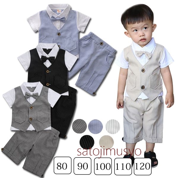 ベビースーツ 男の子 スーツ ベビー フォーマルスーツ 切り替え風 男の子 上下セット タキシード 半袖 ストライプ 2点セット 重ね着 ベビー フォーマル 紳士服