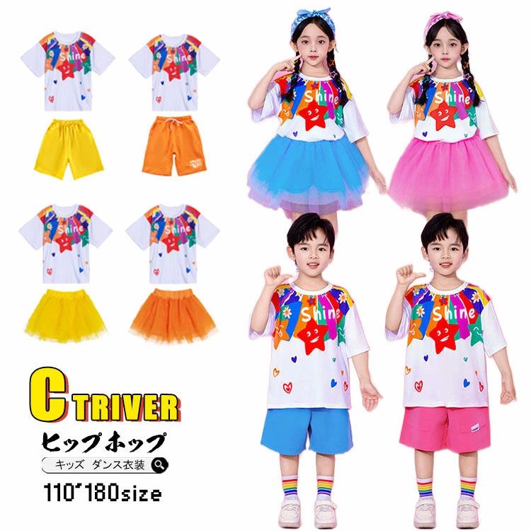チアダンス 衣装 キッズ 小学生 カラフル キッズダンス衣装 セットアップ チアガール 衣装 女の子 メッシュスカート ふんわり 応援団 可愛い tシャツ 虹色 半袖