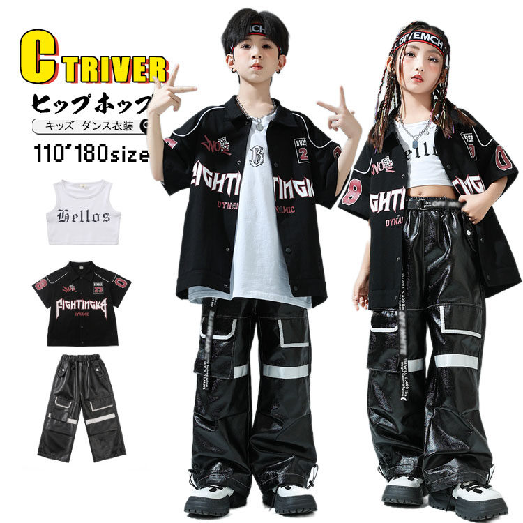 ベースボールシャツ 黒 レザーパンツ キッズダンス衣装 セットアップ ヒップホップ シャツ 半袖 ワイドパンツ ヒップホップ 子供服 カッコイイ 男の子 女の子 k-