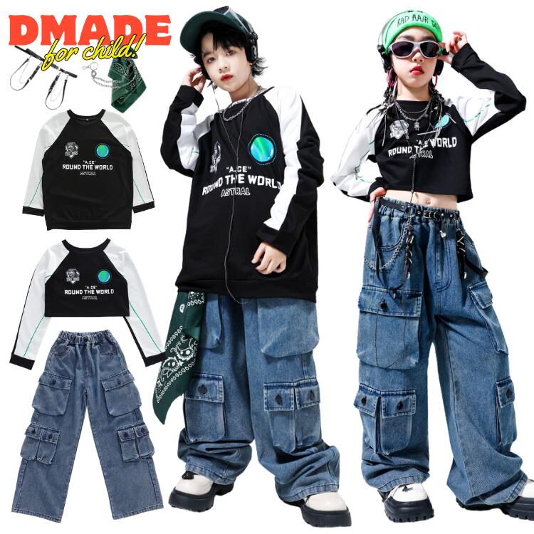 キッズダンス衣装 セットアップ 男の子 女の子 2点セット トップス パーカー ロングパンツ カーゴパンツ ブラック グリーン デニム イラスト ジンズ ダンス衣装