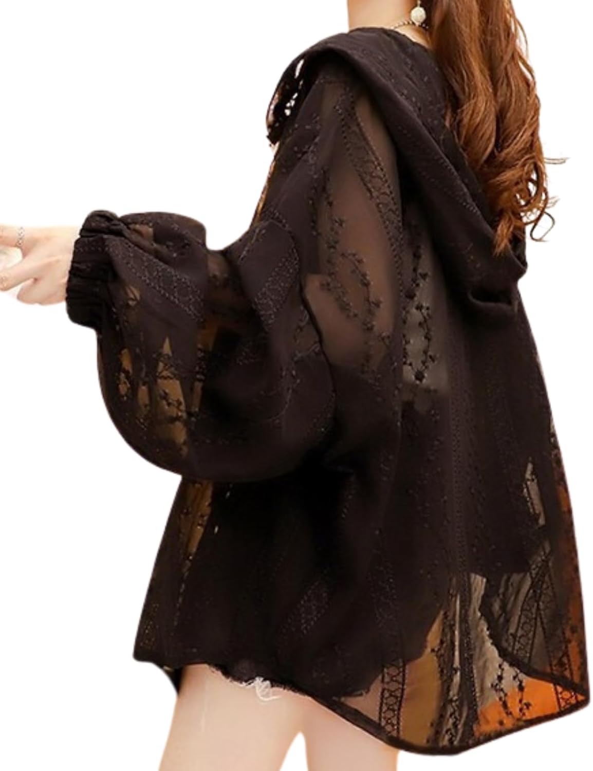 オーバーサイズ パーカー シースルー UVカット パフスリーブ 体系カバー 刺繍 レース フード 羽織 シャツ(xq400)