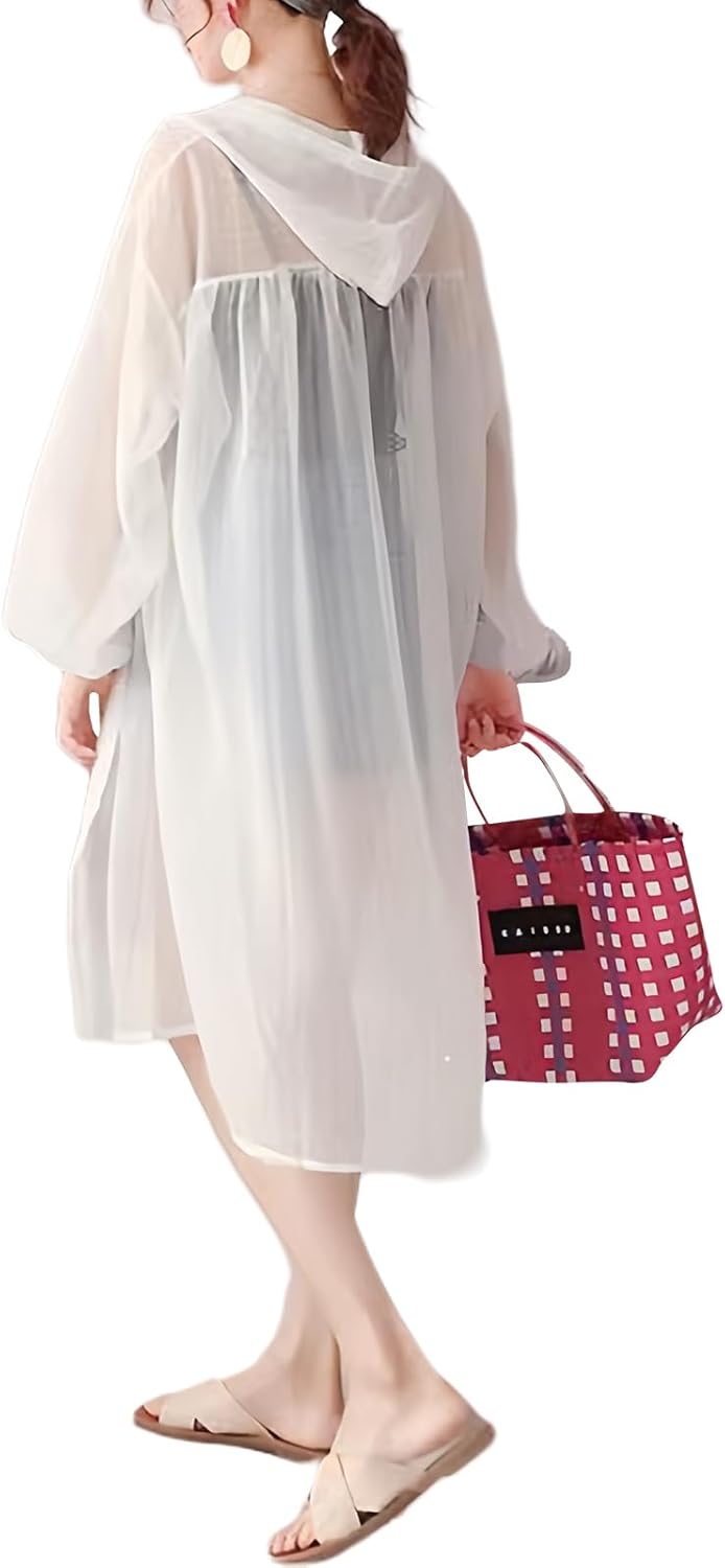 UVカット パーカー レディース 透け感 日焼け対策 パフスリーブ ロングスタイル スウェット 薄い 膝丈 長袖 フード付き(xq434)