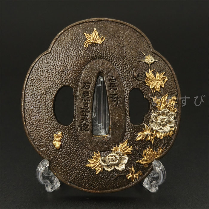 刀鍔 日本刀装具 牡丹と蝶の図 刀鍔 銅地 細工 絵金銀 鍔 刀の鍔 ツバ 鐔 刀鐔 刀剣美術 武道具
