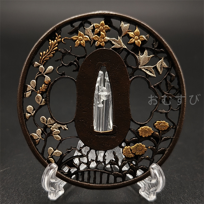 刀鍔 日本刀装具 花の図 刀鍔 銅地 細工 絵金銀 鍔 刀の鍔 ツバ 鐔 刀鐔 刀剣美術 武道具