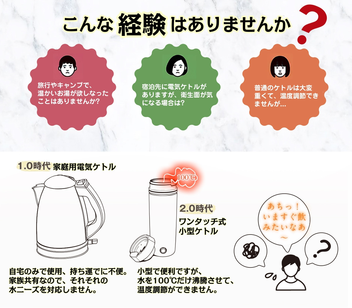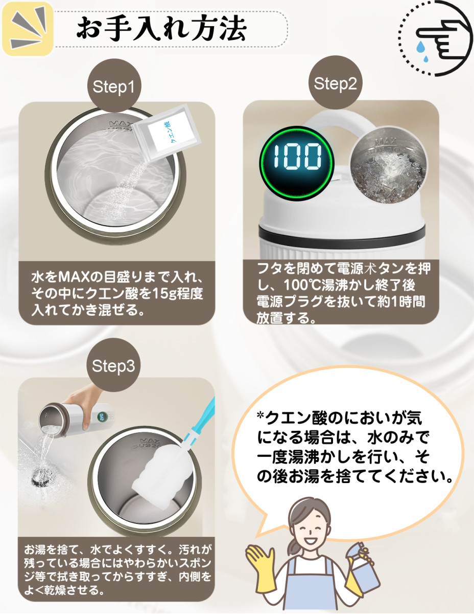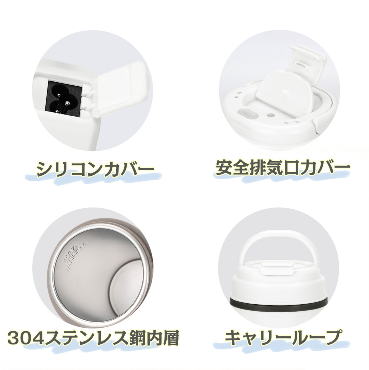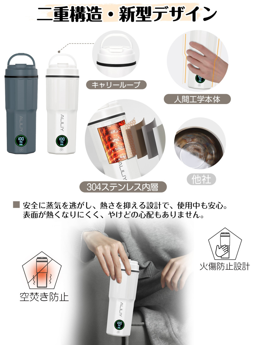 「二重構造&無臭・火傷防止」 二重構造を採用しており、表面が熱くなりにくいため、火傷の心配がありません。【三重安全保護】 「沸騰後自動電源オフ」「過熱保護」「空焚き防止」機能を搭載し、安全性を高めています。 ※水以外の液体の加熱は禁止です。