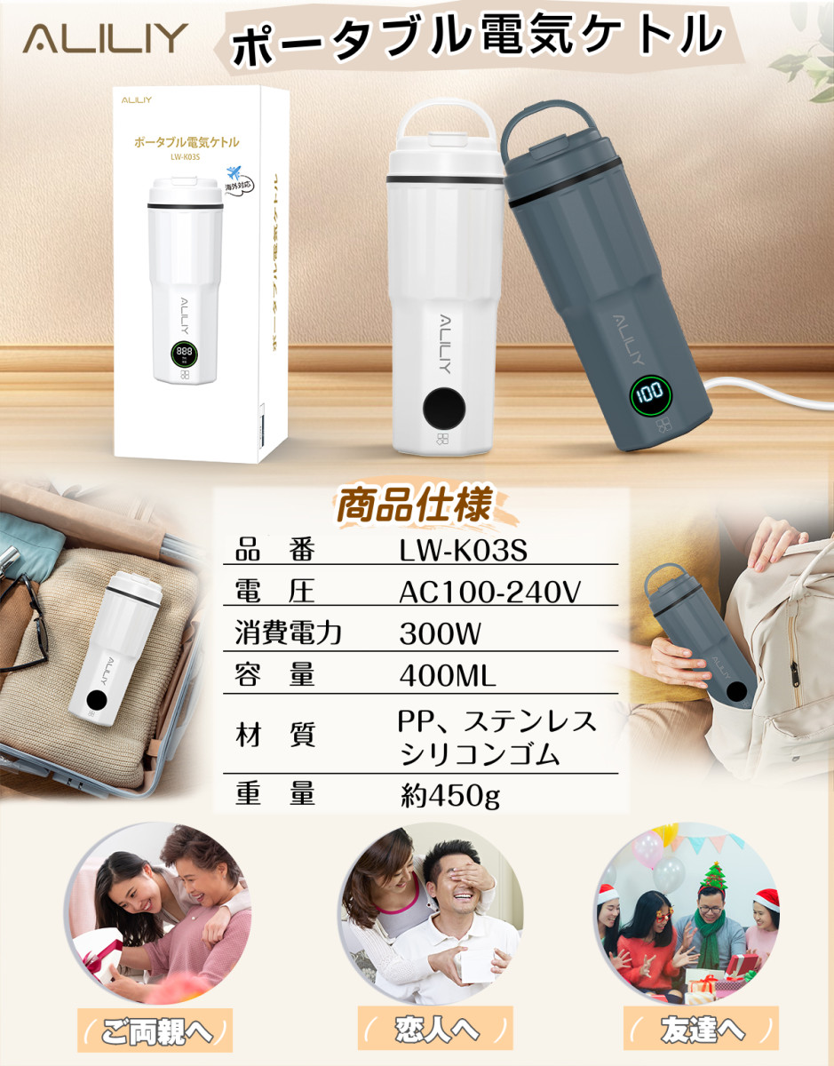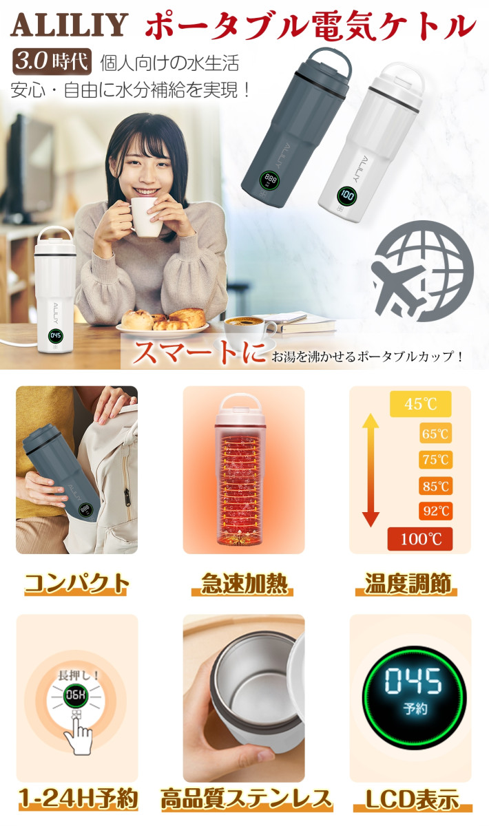 電気ケトル ポータブル 海外対応 携帯 湯沸かしケトル 小型 6段階温度調節 1-24H予約機能 保温 400ml トラベルケトル ステンレス 二重構造 旅行 一人用 ギフト