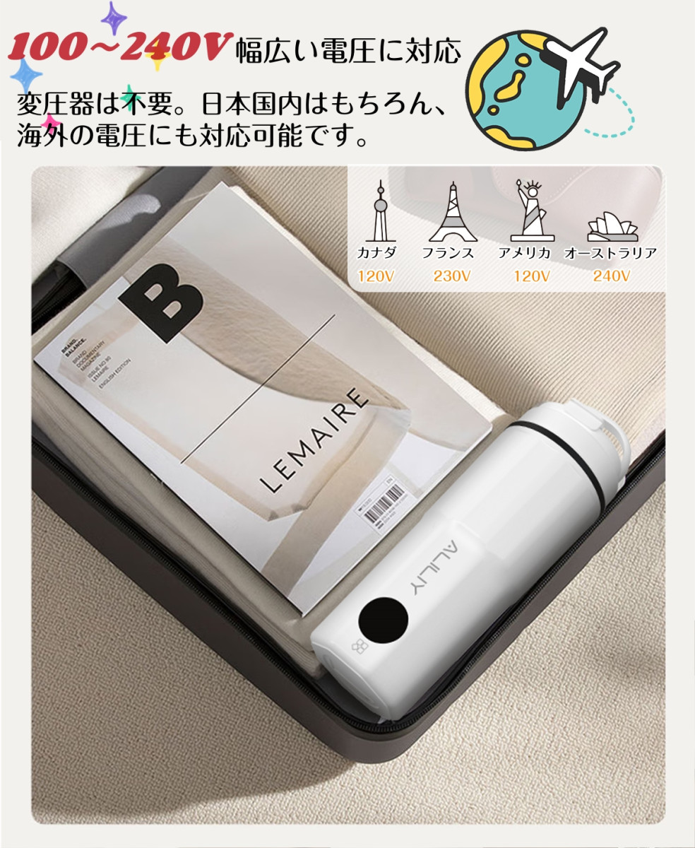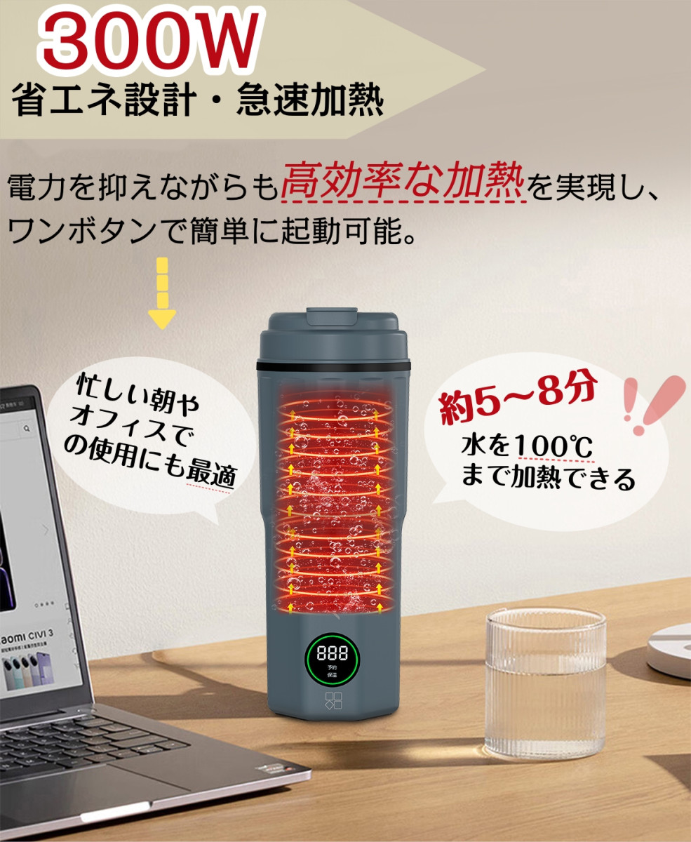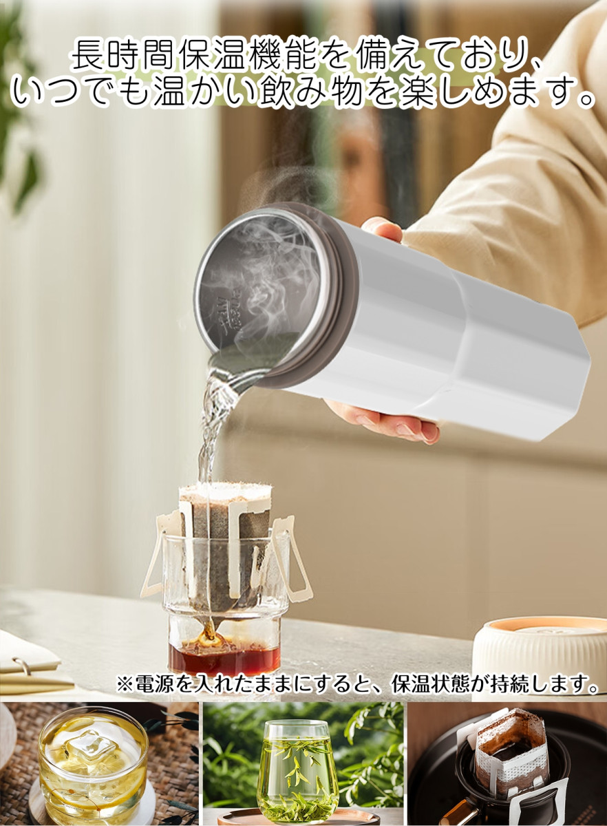 「コンパクト・携帯性に優れたデザイン」 コンパクト設計で、バッグやスーツケースにすっきり収納でき、旅行や出張先でも手軽にお湯を沸かせます。 300Wのハイパワー設計で、お湯がすぐに沸き、忙しい朝や外出先でも待ち時間を短縮できます。
