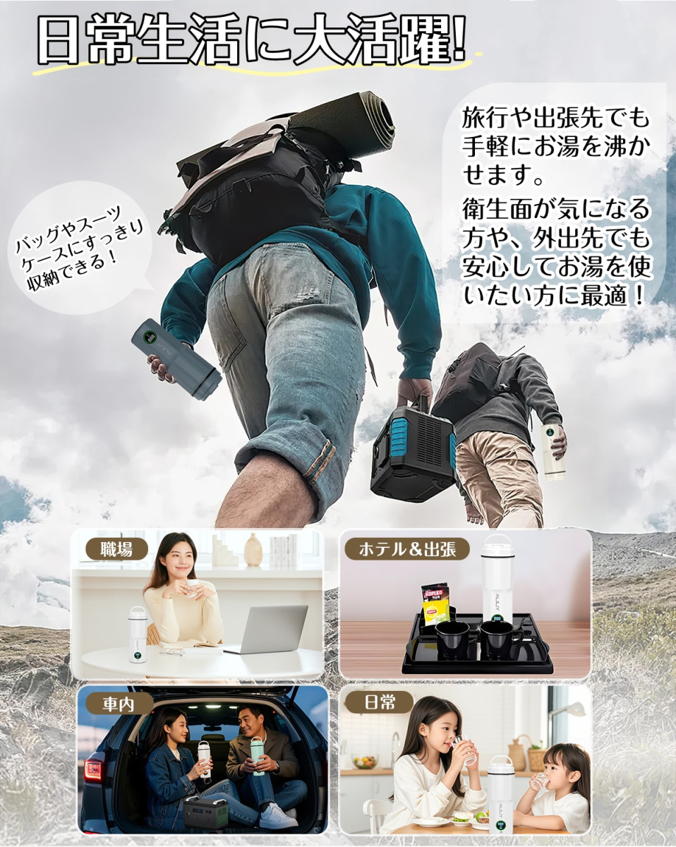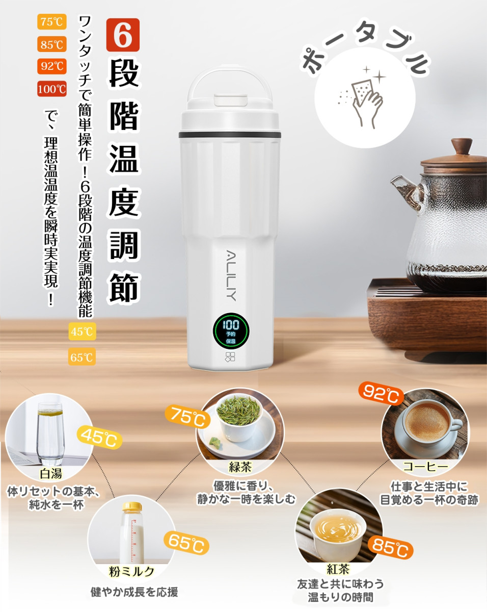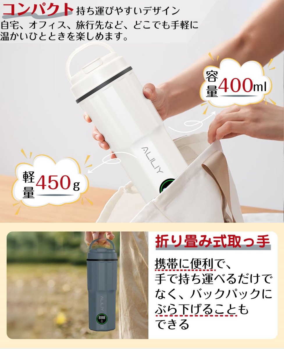 「コンパクト・携帯性に優れたデザイン」 コンパクト設計で、バッグやスーツケースにすっきり収納でき、旅行や出張先でも手軽にお湯を沸かせます。 300Wのハイパワー設計で、お湯がすぐに沸き、忙しい朝や外出先でも待ち時間を短縮できます。