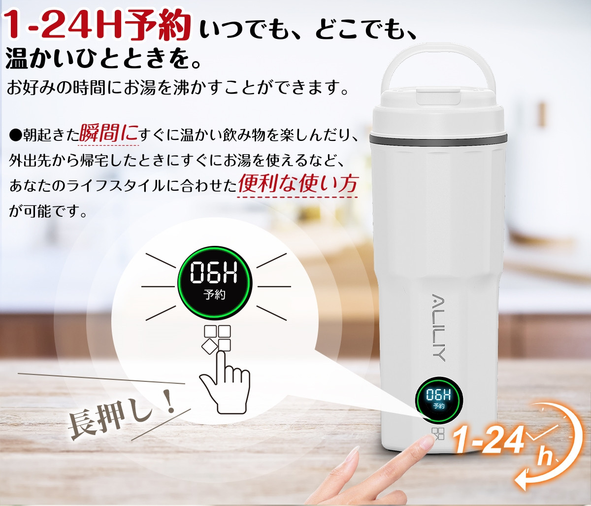 「1〜24時間予約設定」お好みの時間にお湯を沸かすことができます。 朝起きた瞬間にすぐに温かい飲み物を楽しんだり、 外出先から帰宅したときにすぐにお湯を使えるなど、 あなたのライフスタイルに合わせた便利な使い方が可能です。