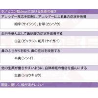 d-クロルフェニラミンマレイン酸塩を中心に、荊芥(ケイガイ)、細辛(サイシン)、白し(ビャクシ)などで鼻炎のアレルギー症状を改善し、くしゃみ・鼻みず・鼻づまり・なみだ目に効果を示します。辛夷(シンイ)、細辛(サイシン)は鼻づまりを改善し、甘草(カンゾウ)は種々の炎症を抑えてのどの痛みを改善し、ショウキョウとともに鼻炎・副鼻腔炎の回復を手助けします。