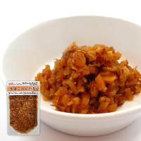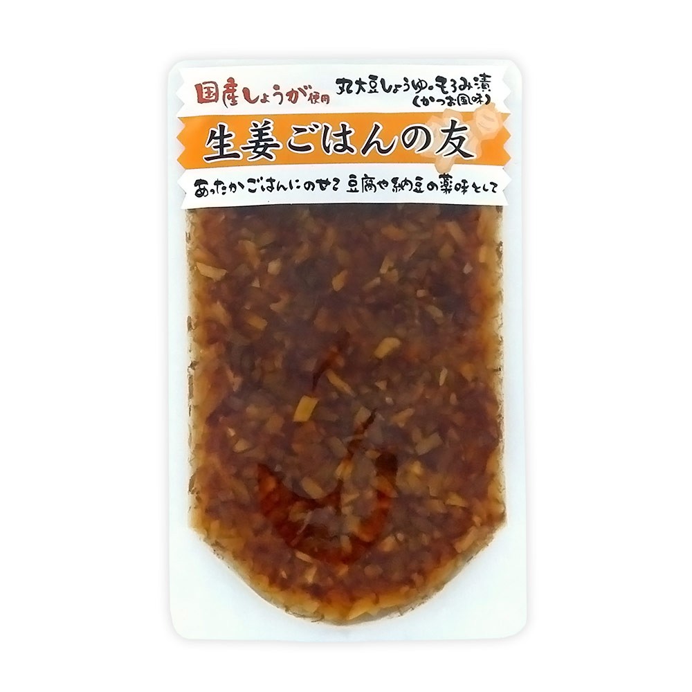 国産しょうがをみじん切りし、かつお節を合わせ、丸大豆しょうゆ、麦芽水飴、丸大豆しょうゆのもろみ、三温糖などで漬け込み、しょうがの風味とやわらかな辛味を引き出したもろみ味に仕上げました。