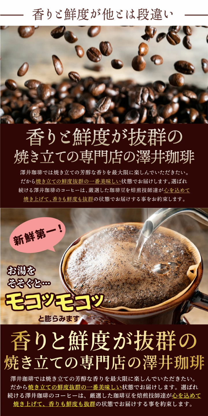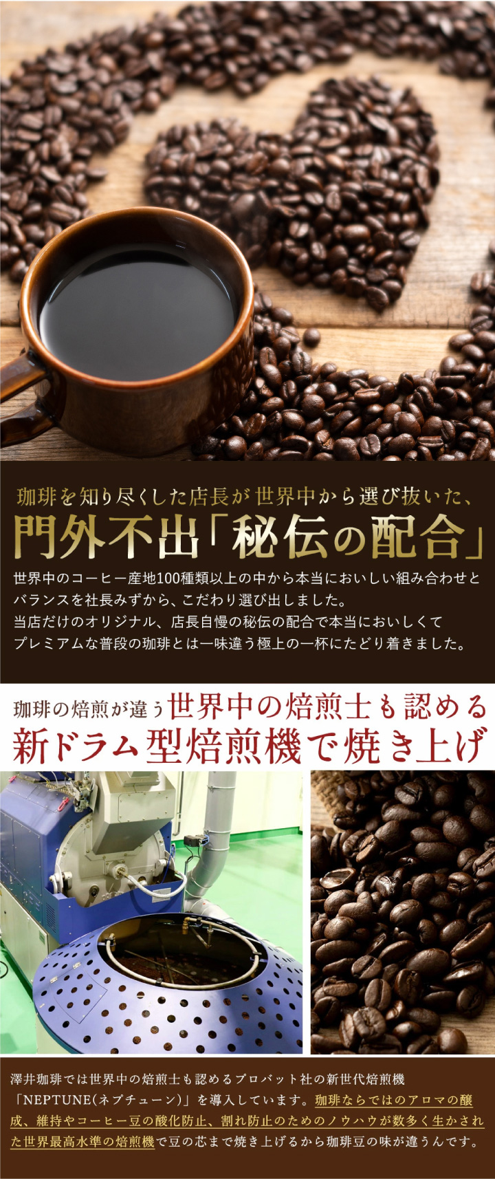 | 深煎りならではのしっかりとしたコクと苦みの中に、やさしい甘さが広がるブレンドコーヒーです。世界基準の焙煎機で豆の芯まで焼き上げ、焼き立ての香りと鮮度をそのままお届け。毎日の一杯が、ほっとできる特別な時間に変わります。 1.深煎りなのにやさしい甘さ ヨーロッパ伝統の深煎りで仕上げたコーヒーです。しっかりとしたコクとほどよい苦みがありながら、飲み進めるとほんのり甘さを感じられます。酸味はひかえめで、苦いだけの珈琲が苦手な方にもおすすめです。口に入れたときは力強く、その後に広がるやわらかな甘みと長く続く余韻が特長です。ミルクとの相性もよく、カフェオレにするとコクはそのままで、甘みがよりはっきり感じられます。深煎りが好きだけれど、飲みやすさも大切にしたい方にぴったりの味わいです。 2.世界が認めた焙煎機で芯まで香ばしい 世界中の焙煎士から評価されている新しいドラム型焙煎機で、豆の中までしっかり火を通しています。この焙煎機は、コーヒーのよい香りを引き出し、豆の酸化や割れを防ぎながら焼き上げることができます。そのため、雑味の少ないきれいな味わいに仕上がります。世界中のコーヒー産地100種類以上の中から選び抜いた豆を、こだわりの配合でブレンド。毎日飲んでも飽きない、バランスの良い美味しさを実現しました。 3.焼き立ての香りと安心をそのままお届け 焼き立てならではの豊かな香りと新鮮さを大切にしています。お湯をそそぐと、粉がふんわりとふくらみ、新鮮さを目で見て感じられます。専門店ならではの管理体制のもとで品質を守り、国際規格の認証も取得。安全で安心できるコーヒーをお届けします。中挽きか、豆のままかを選べるので、ご家庭の器具に合わせて楽しめます。400g入りが3袋セットなので、たっぷり楽しめるのも嬉しいポイントです。 | |