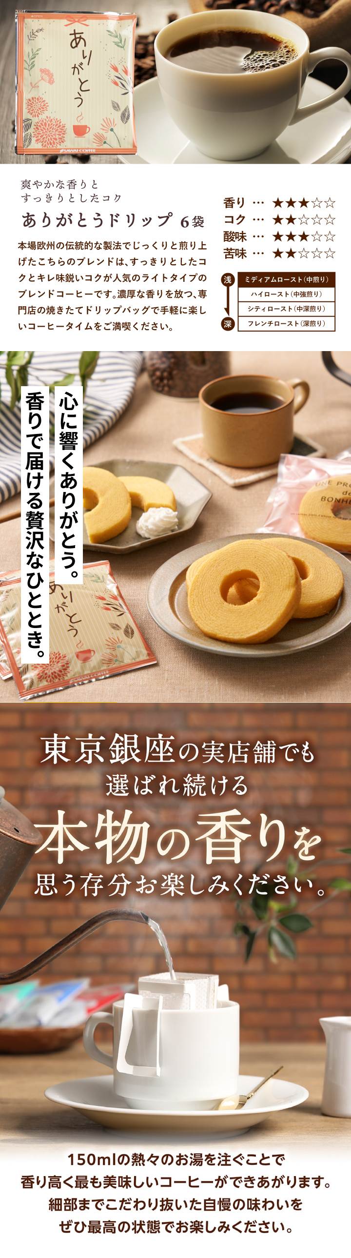| 内容量 | ・ドリップバッグ ありがとうブレンド 8g×6袋 ・ミニ バウムクーヘン 4個 |
