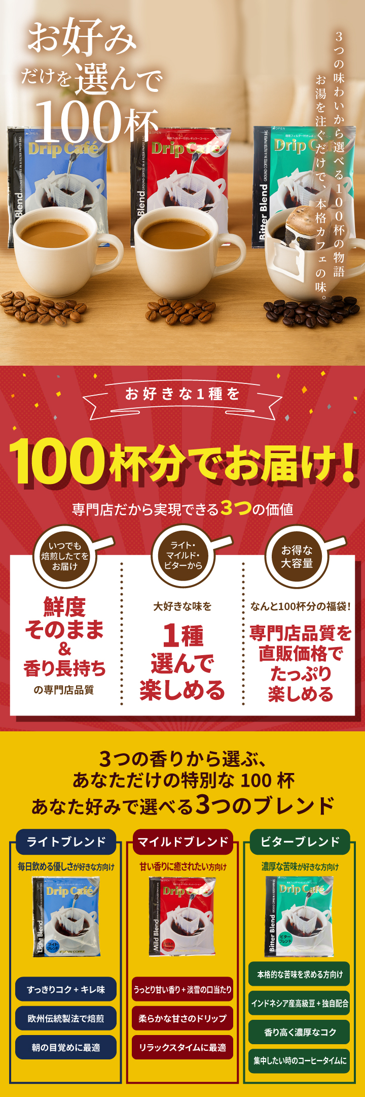 | 内容量 | ●ドリップバッグコーヒー 8g×100袋(ライトブレンド、マイルドブレンド、ビターブレンドのお選びいただいた1種類) |