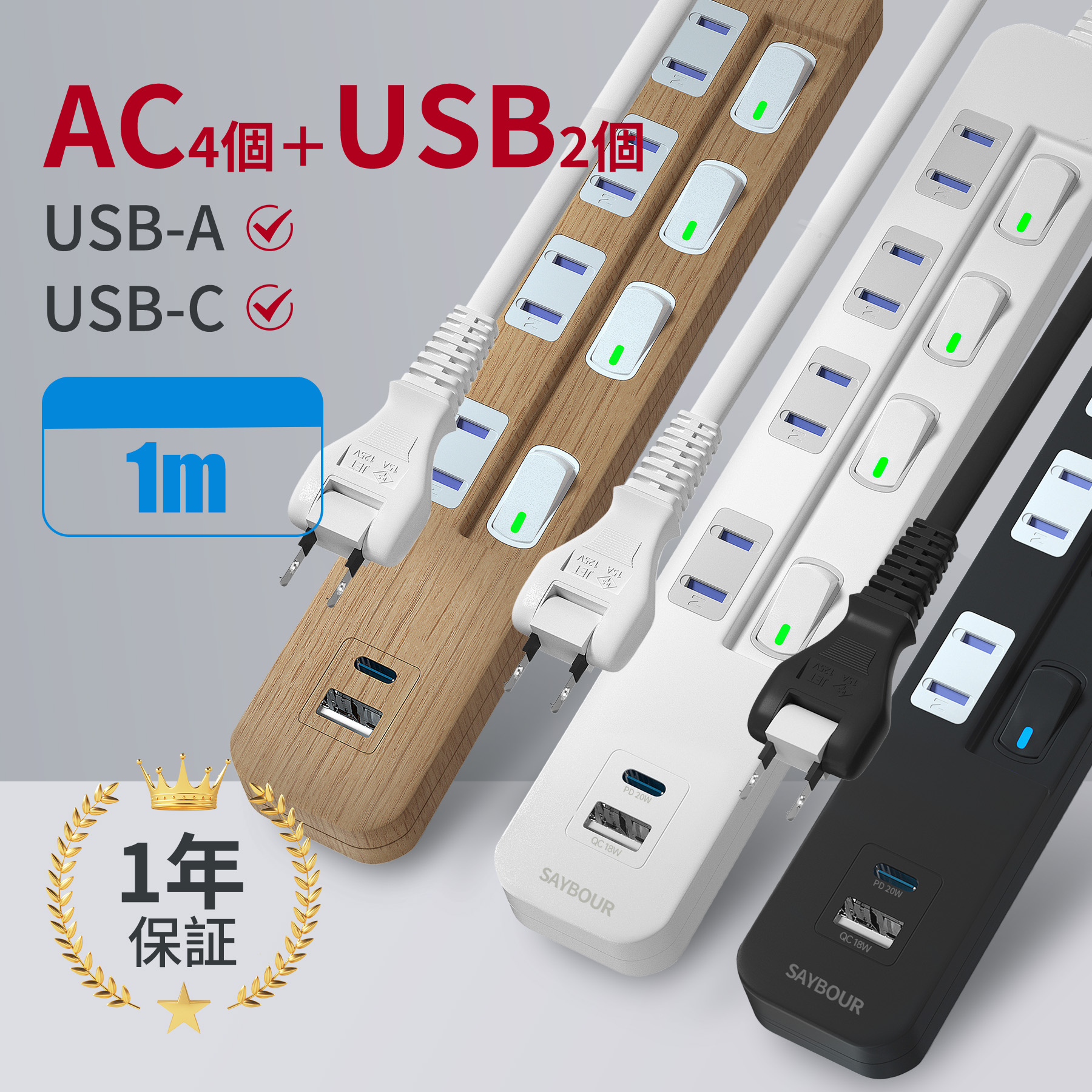 type-C USB 延長コード 1m 電源タップ AC4個口 + 2USB PD QC急速充電 USB-A PD 雷ガード 雷サージ 海外 240V スマートIC コンセント タップ
