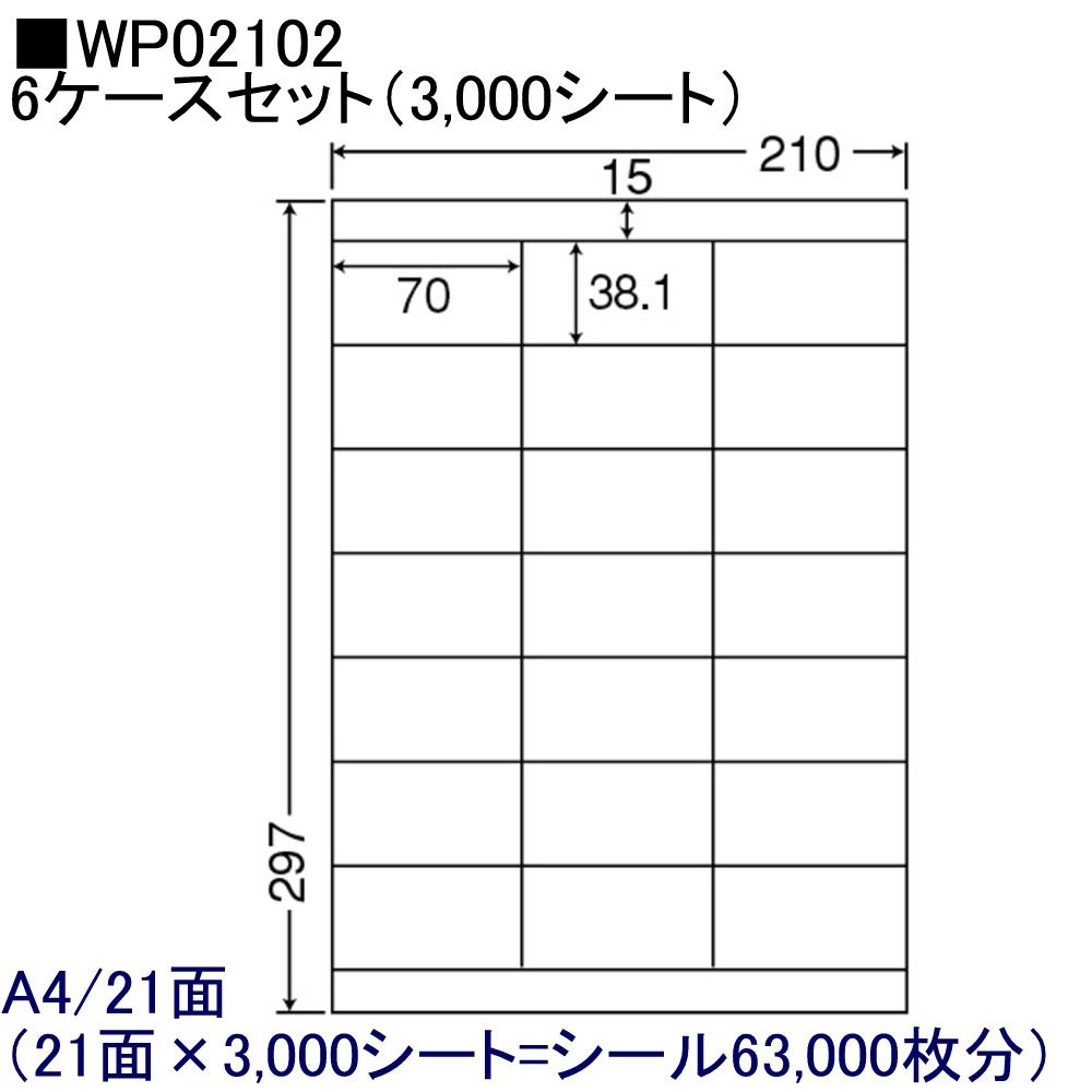 ★激安 WPラベルシリーズ■メーカー:東洋印刷 (*注)生産ロットにより質感の違いが出る場合があります。■品番:WP02102■A4/21面 ★6ケースセット■ラベルサイズ:70×38.1mm■6ケース=合計3,000シートの価格です。◆◆数量ごとに単価が変わります。◆◆1ケース単位/403-0011(当店注文番号)なら1ケースあたり¥4,498★★2ケースセット/413-0011(当店注文番号)なら1ケースあたり¥4,191★★4ケースセット/423-0011(当店注文番号)なら1ケースあたり¥4,045★★10ケースセット/443-0011(当店注文番号)なら1ケースあたり¥3,463★