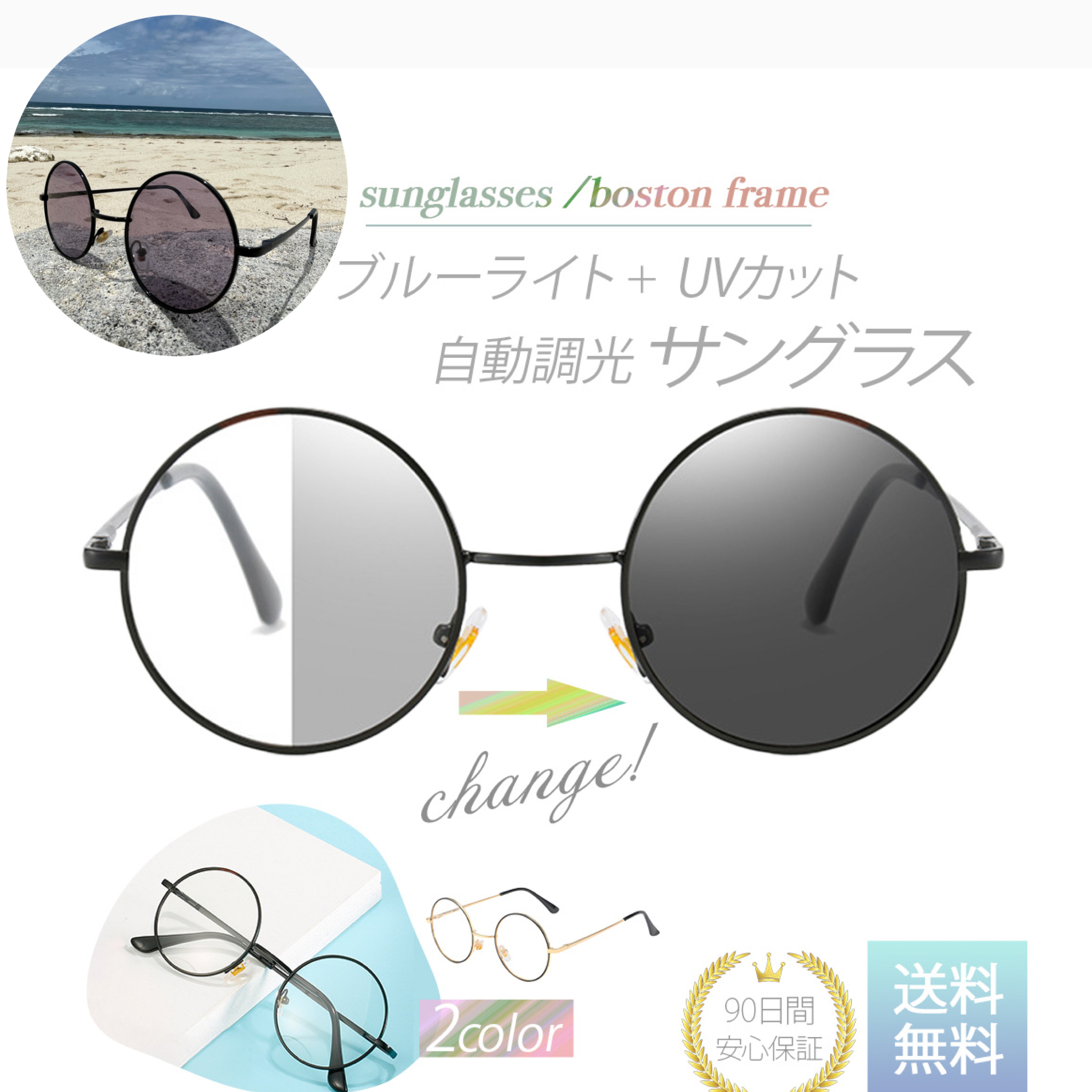 サングラス レディース メンズ 丸メガネ ラウンドタイプ UVカット ブルーライトカット 調光サングラス 調光メガネ