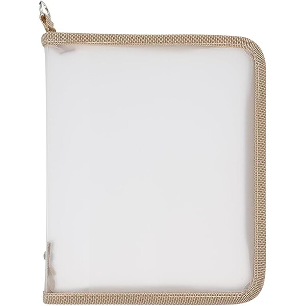 3辺を囲むラウンドファスナーで開閉でき、表紙側にはカードやシールなどが挟めるPVC素材の袖ポケットが1つあります。