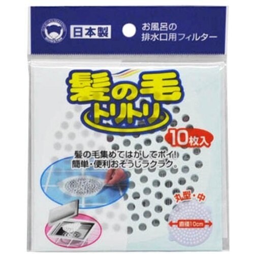 「髪の毛トリトリ丸型 中 10枚入」は、粘着タイプで取り付けが簡単な、お風呂用の排水口フィルターです。