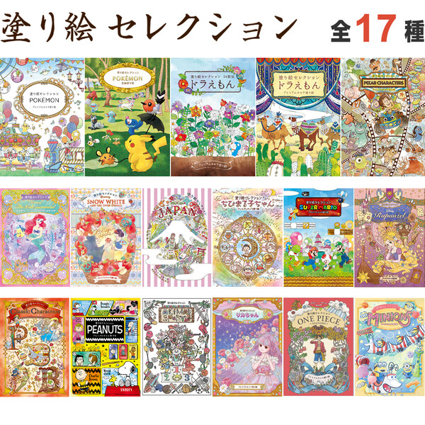 大人気キャラクターの緻密で繊細な「塗り絵セレクション」シリーズです。 全部で17種類!