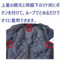 襟元と両脇下の3ケ所にボタンを付けて、ループでとめるだけですぐに着用。ベストやセーターを着なくても暖かく過ごせます。